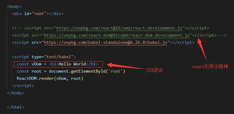 <h1>Hello World</h1>这是一个对象,叫做虚拟 DOM 对象,后面会讲到。 <script>标签的 type 属性为text/babel。由于使用了 JSX 这种特殊的语法,我们不能再像往常一样,使用<script type="text/javascript">来解析 JSX,而要借助 babel 来进行解析、转换成 JS。- 将 JSX 语法转为 JavaScript 语法,这一步很消耗时间。所以现在前端项目,都会使用工作流的形式来构建,不会在 html 页面中直接引入 react、写 js 代码等等。