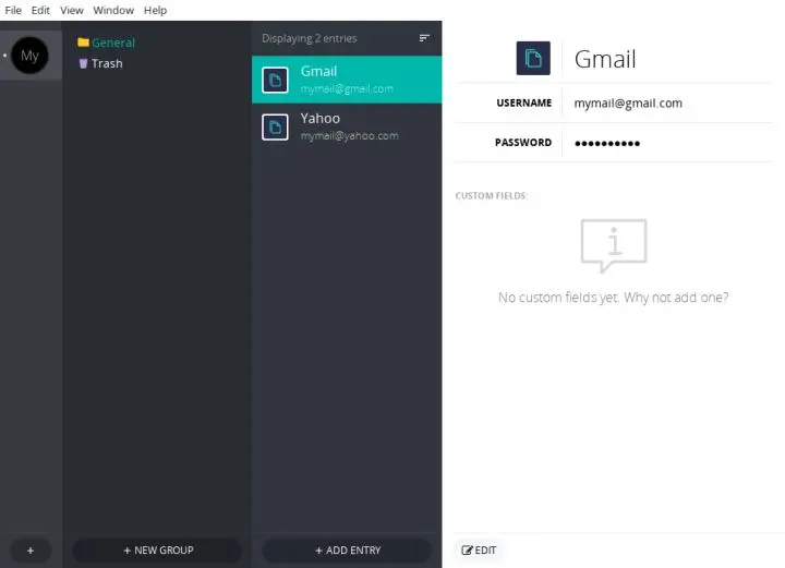 你还可以将登录的详细信息分组到不同的名称下,以便于识别。例如,你可以将所有邮箱账户分组到一个名为 “my_mails” 的名称下。默认情况下,你的登录详细信息将保存在 “General” 群组下。要创建新的群组,请点击 “NEW GROUP” 按钮并输入名称。在新的群组中创建新条目时,与上述的步骤相同,只需单击组名并开始添加条目。