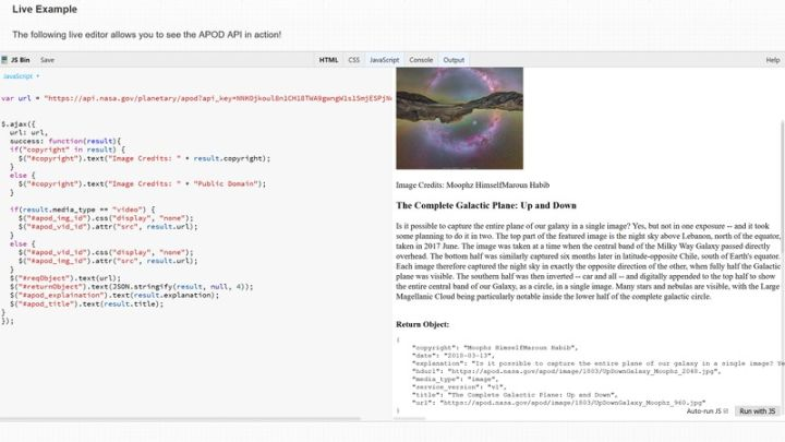 NASA 的 Open API 主要针对应用程序开发者,旨在显著改善数据的可访问性,也包括图片内容在内。该网站有一个实时编辑器,可供你调用每日天文一图(APOD) 的 API。