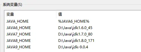 JAVA_HOME:若需JDK1.6版本变量值设为%JAVA6_HOME%,若需1.9版本变量值设为%JAVA9_HOME%,便于切换。