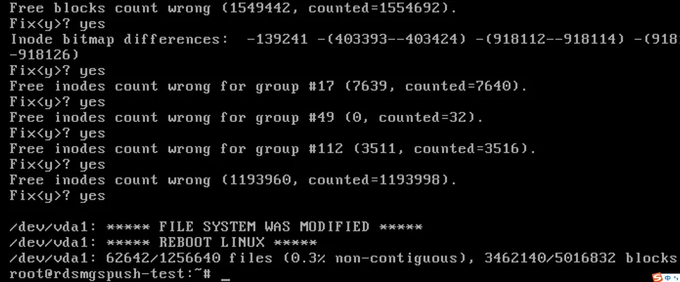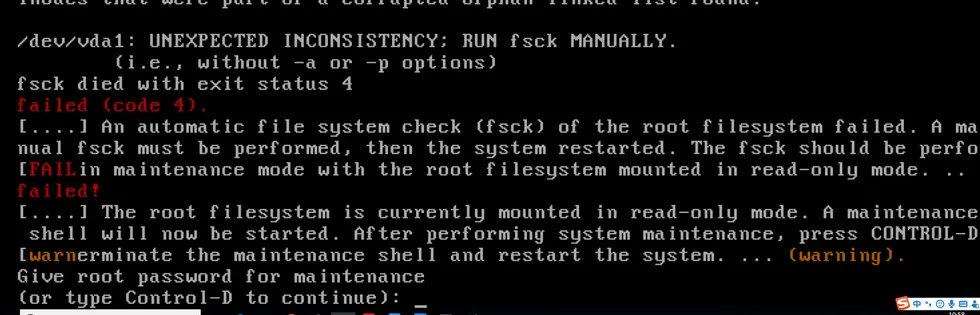通常的解决方法是重启系统以root用户进入单用户模式,运行fsck.ext3 –y /dev/vda(如果是ext4使用fsck.ext4修复),/dev/vda是系统/根分区。修复完reboot进入系统。以debian系统为例: