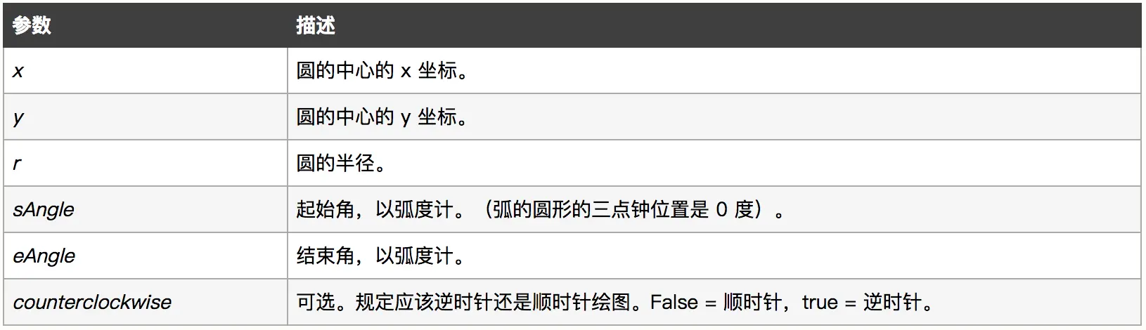 context.arc(x,y,r,sAngle,eAngle,counterclockwise);