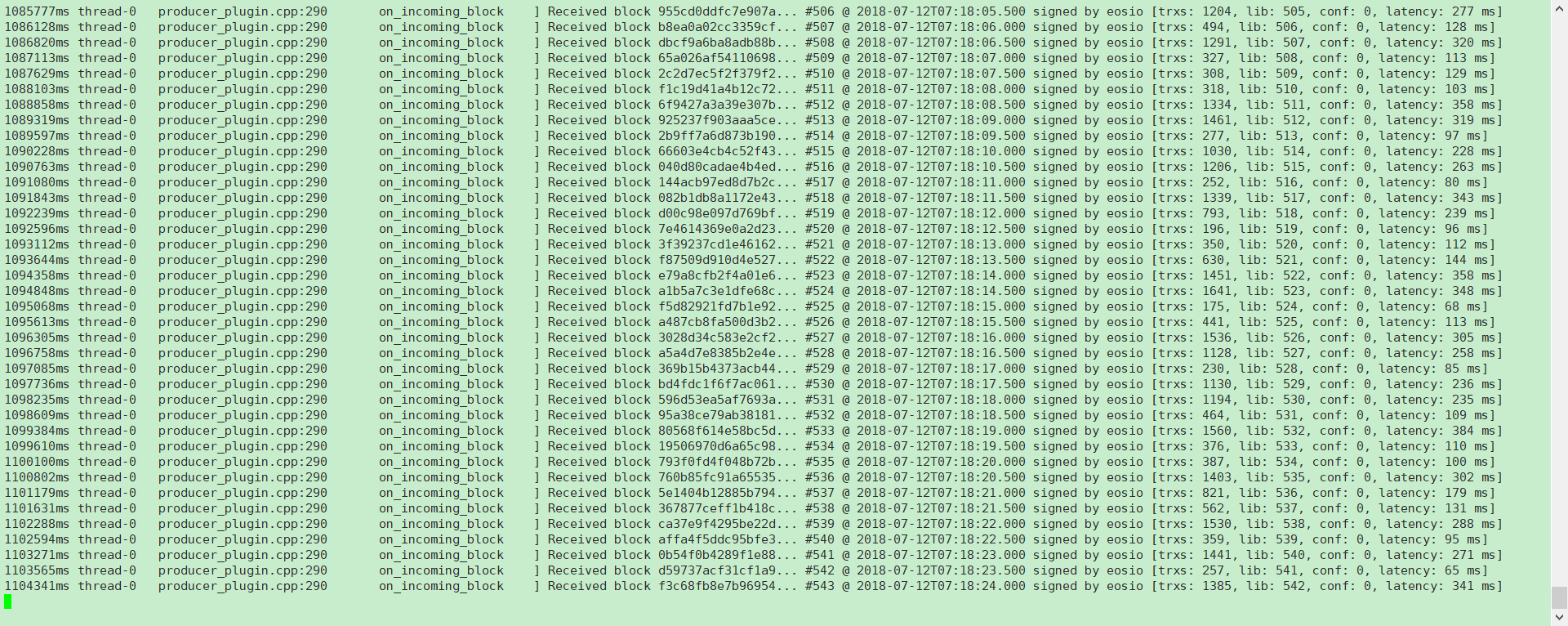 执行成功以后,我们将得到一个拥有1000个stake账户(简单理解为已抵押完可直接投票的账户)的单节点eos环境,最后一个参数-X会让当前环境不断执行随机转账操作(注意:每一笔转账都是一个action,一个action对应一个transaction)