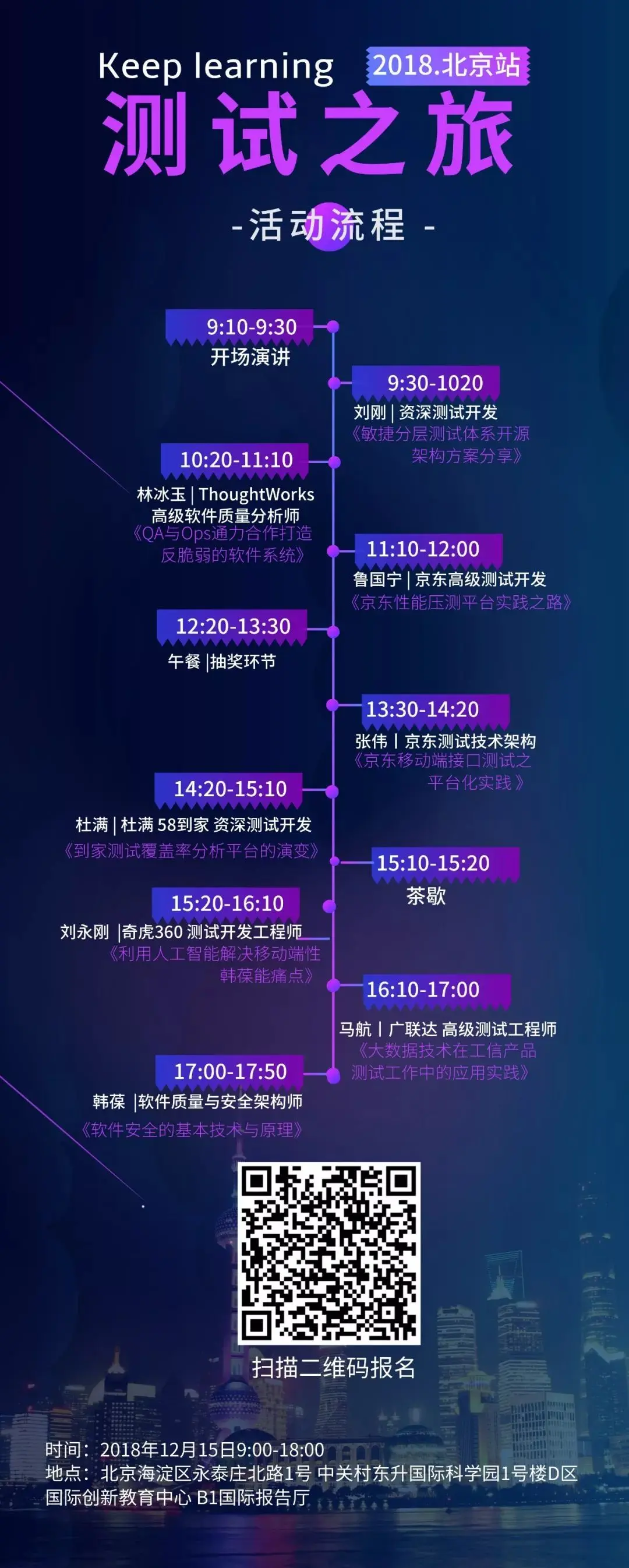 测试之旅是测试公益社区Testwo(测试窝)发起的以软件测试为主题的系列活动。活动旨在为广大软件测试从业人员提供一个分享交流的平台,使大家不但能够学到软件测试中的技能,更能开阔眼界,并能在活动中结识更多志同道合的伙伴。本次活动邀请了来自 京东、ThoughtWorks、奇虎360、58到家、广联达等企业的测试领域专家作为演讲嘉宾,给大家带来了包含AI、大数据测试、生产环境中的QA及接口测试等大家关心的主题。