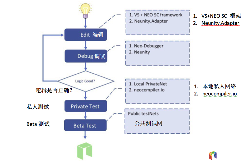 传统上来说,NEO智能合约开发有两步开发流程:编码和测试。这篇官方的教程提供了关于这个工作流程的详细信息。