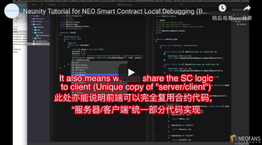 在编码阶段,NEO官方支持C#(示例)。我们也可以使用Java和Python开发智能合约。你可以轻松的在Google和YouTube上找到教程和示例代码页,以了解如何编写NEO智能合约。