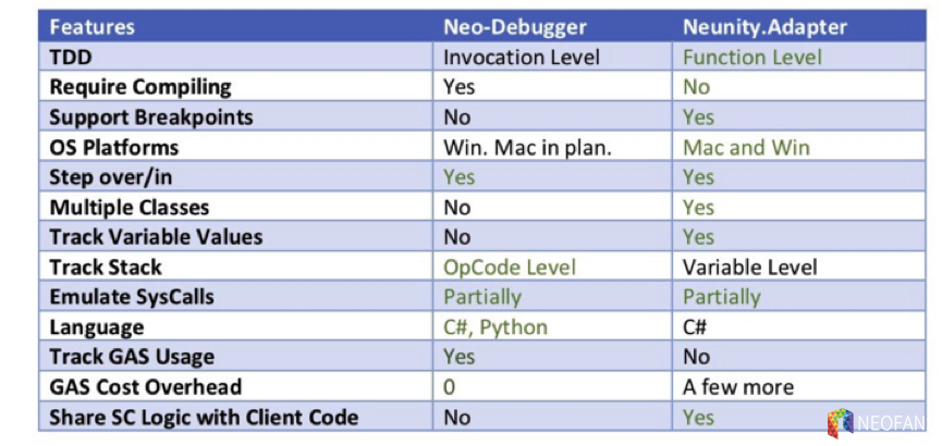 与下表相比,我们可以相应看到Neo-Debugger和Neunity.Adapter的优势。根据我们的经验,Neo-Debugger更适合小规模项目,因为它不消耗GAS,而Neunity.Adapter更适合较大规模或更复杂的项目,因为它更好地支持TDD,多类,断点,变量跟踪等。