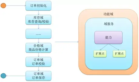 2.根据梳理出来的主业务流程及可能存在的差异点,定义出上述的功能域、域服务、能力及扩展点。
