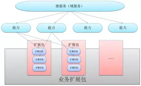 以订单创建过程为例来谈谈什么是微服务扩展,以及如何用微服务扩展来实现订单的业务中台。订单创建的过程其实是一系列功能的组合,如库存校验,商品价格计算订单校验等。每个功能都对应到一个领域服务,如库存校验对应到库存领域服务,商品价格计算对应到价格领域服务。每个领域服务都会提供一些核心的能力,如库存领域服务提供库存查询、校验、扣减等能力。而每个能力可以提供一系列的扩展点,来根据不同的业务走不同的扩展实现。如库存查询的能力可以提供库存策略的扩展点,根据业务需求可以实现商品级库存,批次库存等的扩展实现。订单创建流程以及抽象出来的各种功能域及能力就是我们需要的业务中台,而业务的差异化实现可以根据业务中台提供的能力扩展点去实现自己的业务扩展。下图是微服务扩展的基本概念图。