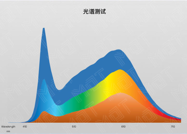 另外,光源的光谱特性也是决定其显色性的重要因素,因此我们也测量了明基 ScreenBar Lite 的光谱来给大家作为参考,彩色为自动调整模式下 4000K 色温时的光谱,橙 / 蓝色分别为 2700K 和 6500K 时的光谱: