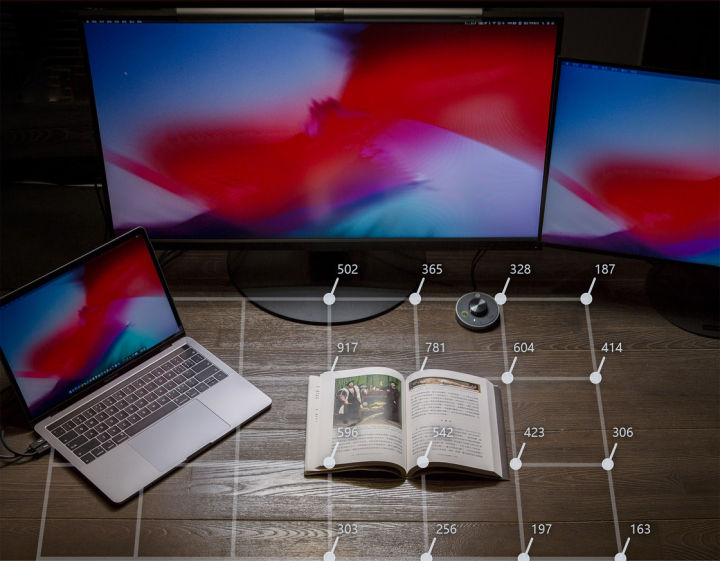 在灯管下沿与桌面平行时,其射出的光源经过导光板被限制在斜 45°~60°,既不会从屏幕反射到人眼,也不会从笔记本键盘和触摸板反射,更不会由高角度直接射入人眼,因此在正常使用角度时越靠近屏幕(也就是灯条垂直投影处)亮度就越低,整体照亮区域的纵向面积相对于之前的 ScreenBar Plus 稍小。