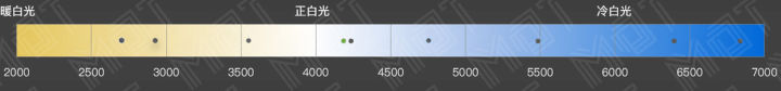 ScreenBar Lite 支持 8 档不同色温档位,从最低的 2700K 一直到 6800K 都可以覆盖,这也意味着 ScreenBar Lite 从钨丝灯(2700K)一直到下午日光(4300K)到平均正午阳光(5300K)都能覆盖,这样的色温覆盖已经可以满足从白天到夜间的色温变化需求,但我们不建议大家长期在超过 4000K 色温的光源下工作,还是要尽量保持 4000K 以下,下图中的点位代表的就是自动模式下我们测得的色温,为 4188K 稍比 4000K 偏蓝但人眼基本无法感知。