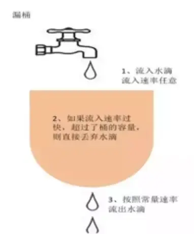 漏桶算法思路很简单,请求先进入到漏桶里,漏桶以一定的速度出水。当水请求过大会直接溢出,可以看出漏桶算法能强行限制数据的传输速率。进入端无需考虑出水端的速率,就像mq消息队列一样,provider只需要将消息传入队列中,而不需要关心Consumer是否接收到了消息。
