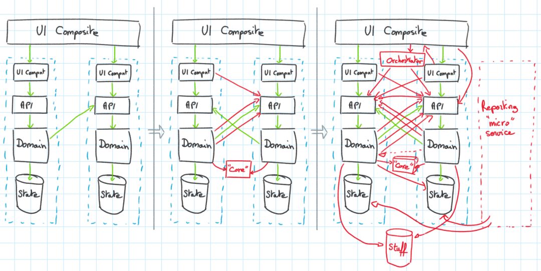 同时几个基本的和结构化问题没有直接的答案,往往需要调整和迭代,例如:如何水平切分关注点,如何共享数据以及以什么方式进行数据复制,如何管理报告,是否应该在服务中包括 UI 组件等。