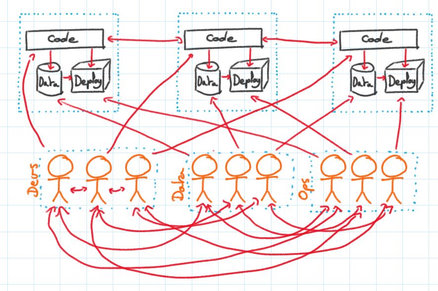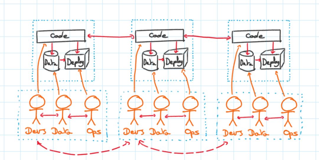 这意味着前端和后端开发人员、数据平台工程师、QA、产品经理和操作人员必须在一个团队中互相合作。