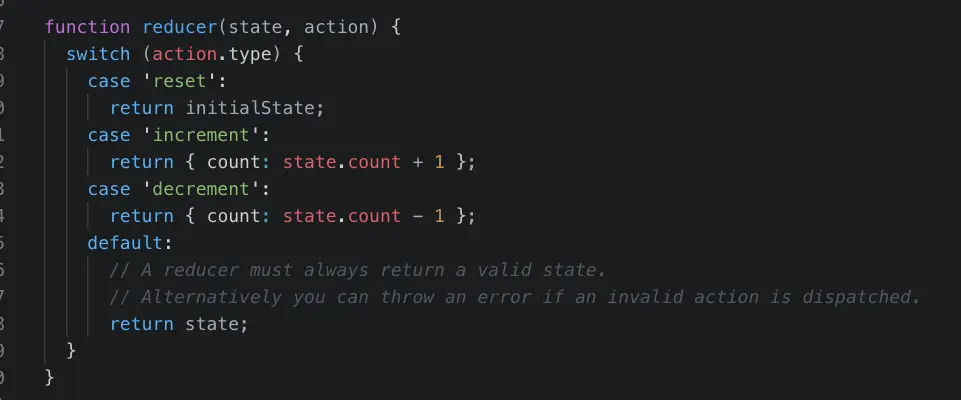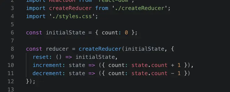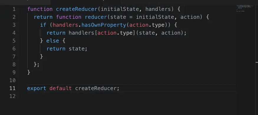 function createReducer(initialState, handlers) { return function reducer(state = initialState, action) { if (handlers.hasOwnProperty(action.type)) { return handlers[action.type](state, action) } else { return state } }}It’s a helper function from the Redux docs that lets you describe reducers as mappings from action types to handlers.