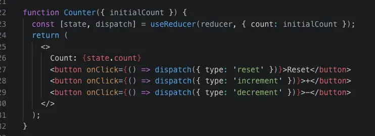 The Counter component calls useReducer with a reducer and initial state, which gives back an array with the current state and a dispatch function.