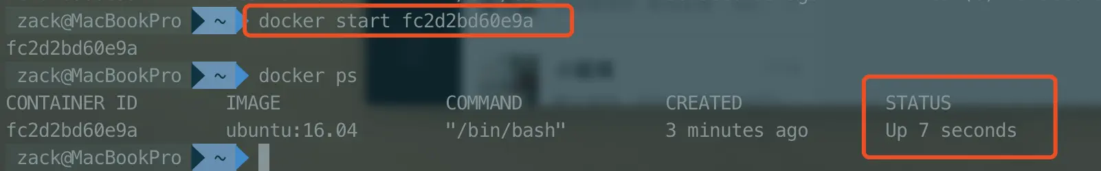 通过docker start ${container_id},我们把这个容器再次启动。通过docker ps(加上*-a包含显示未启动的容器),可以看到容器的状态为UP*。