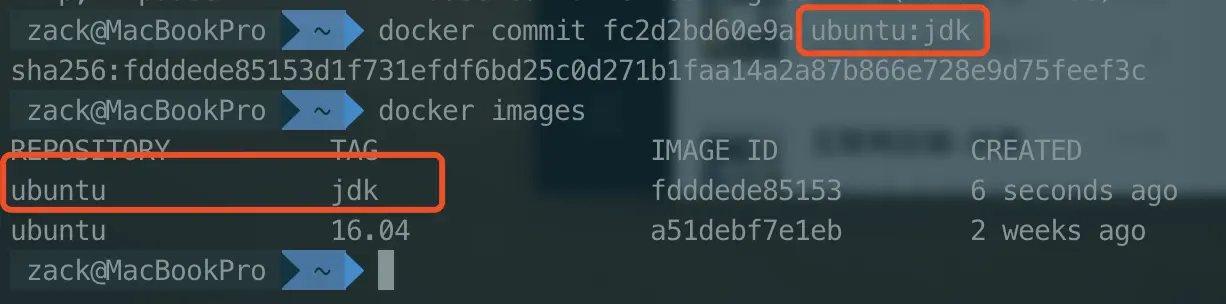 通过docker commit ${container_id} ${repository}:${tag},在本地将容器内容提交到镜像当中。然后就可以拥有一个带jdk的ubuntu镜像了。