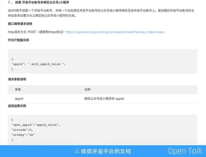 上图是微信开放平台的文档,通过微信给我们开放的接口获取预售码,然后引导商家通过公众号授权给二维火,通过微信提供 API,帮助商家开通开放平台,并且绑定商家的公众号。