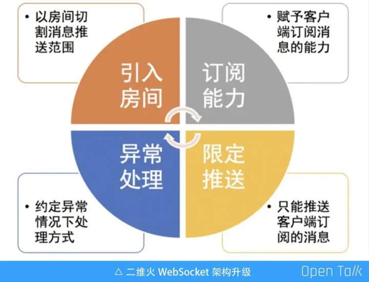 在新版本的流程中,全局只通过持续连接一个 WebSocket 实例,并能实现所有业务,此外引入了“房间”的概念,从打开新实例到断开实例,改为“进入新房间”和“离开房间”,目的是保持链路数只有一条,对此我们进行了架构的升级。