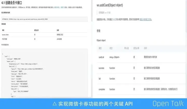 下面介绍微信卡券的功能,如何打通商家卡券与微信卡券的互通?从二维火平台同步到微信卡包,和微信卡包回到二维火平台的实践,需要注意的是,要在开放平台绑定公众号 APP ID 和小程序 ID 才能够实现,然后通过微信开放的接口创建卡券和添加卡券这两个功能进行实现。