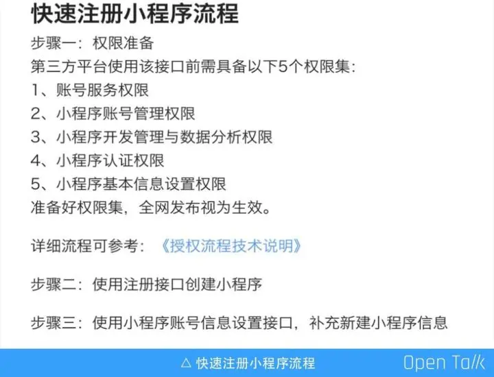 在帮商家开通了开放平台以后,就需要帮助商家打通商家小程序,也就是属于他们自己的小程序,流程也如上图,简单来说,只有三步,首先获取授权码,然后调用微信开放接口进行快速注册小程序,第三步是补充小程序的基本知识,把小程序绑定到商家的开放平台。