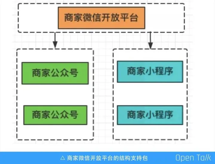 上图是商家微信开放平台的结构支持包,包含了多个商家公众号、多个商家小程序,一个开放平台绑定的公众帐号是有限定的,所以不可能无限制地将商家的公众号绑定到二维火的开放平台中,这时候就需要帮助商家拥有自己的开放平台,快速建立自己的用户体系。如此,商家能够更好更有针对性地维护用户。