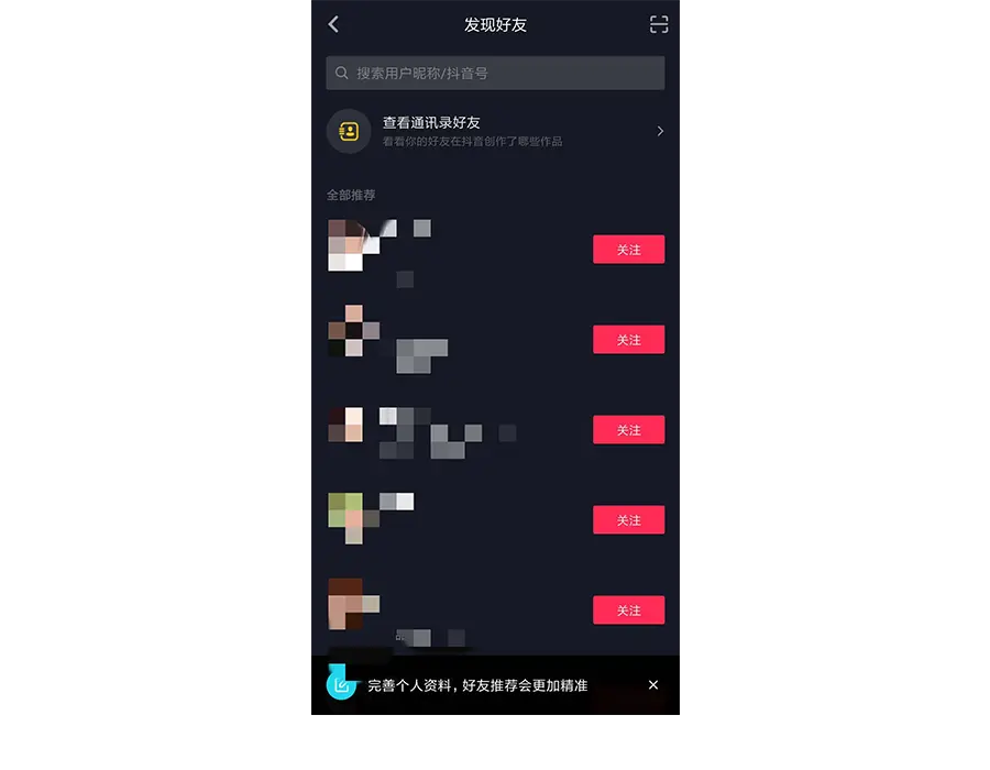 易导入社交链——如下图所示抖音就通过向用户推荐手机通讯录好友的方式,降低用户初次使用产品的陌生感。