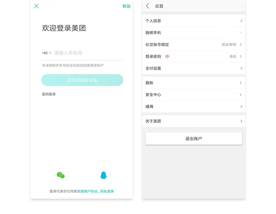 第一种,在注册页面省略设置密码部分,用户使用手机号+验证码即可登录账号,密码后续可在设置项中进一步设置,如下图所示,美团采用的就是这种方式。(这种注册登录方式的优劣势详见下文:“关于注册登录流程你一定感兴趣的几个问题之四——既然手机验证码登录的方式优势很明显,那手机号+密码登录方式存在的价值是什么?”)