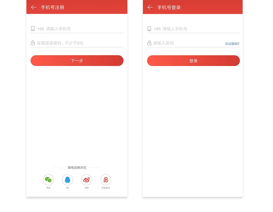 第一种是登录优先,如下图网易新闻登录注册页所示,登录通过较大的视觉重量,也就是button进行展示,而注册按钮躲在右下角,仅通过黑色文字进行展示。