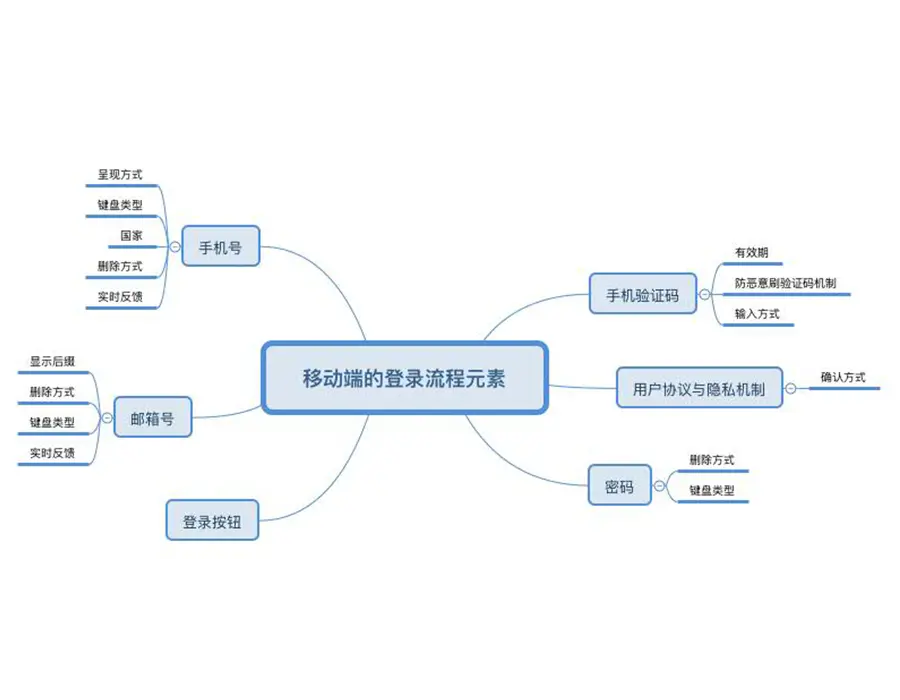 在这里我们先对手机号、邮箱号注册登录流程及第三方创建账号流程涉及到的元素进行拆解,再对这些元素进行逐一分析,从而达到更好的指导设计的目的。具体拆解如下: