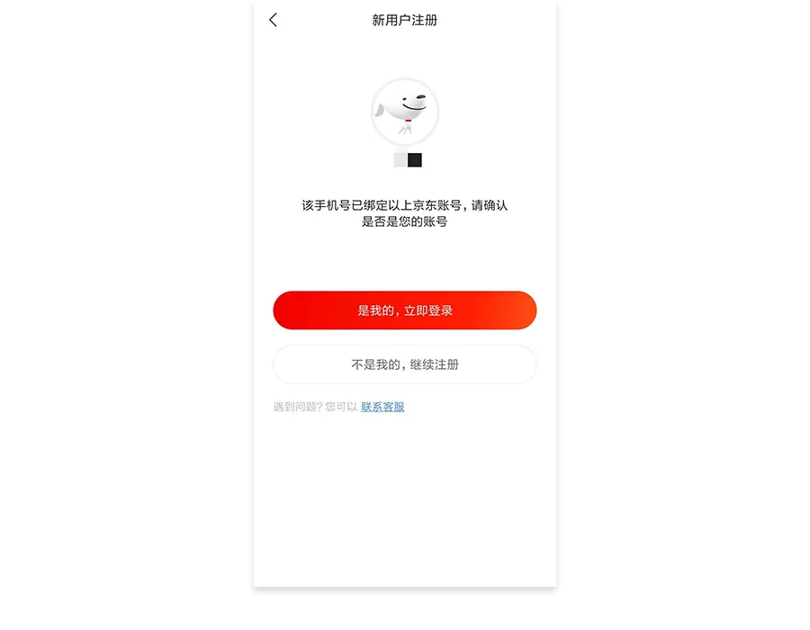 第二种,已注册手机号但是但是否为本人手机号不清楚。如下图所示京东商城在用户注册时,输入的手机号若已注册账号,这时不但给出反馈,还根据该账号是否属于本人提供相应的选项。