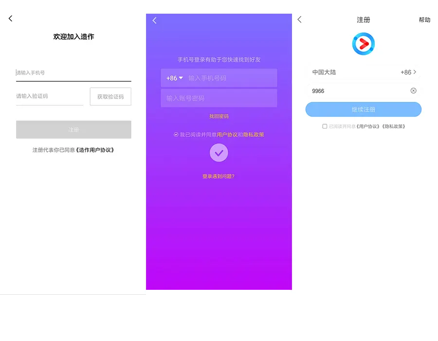 哪一种方式更优秀呢?《About Face 4:交互设计精髓》中有这么一句话:“多数人更愿意与软件的交互和其他实物一样,比如汽车。想去某个地方,就打开车门坐进车里,向前时踩油门,停下来刹车,需要拐弯就打方向盘。”简而言之,将控制权交给用户,对用户来说,到了注册页面几乎所有用户的目的是注册账号,因此正确的做法是先替用户选择好,但最终选择权依然交给用户,这种方式才是更为合理的,也就是上图中间抖音(紫色页面)的设计方式。
