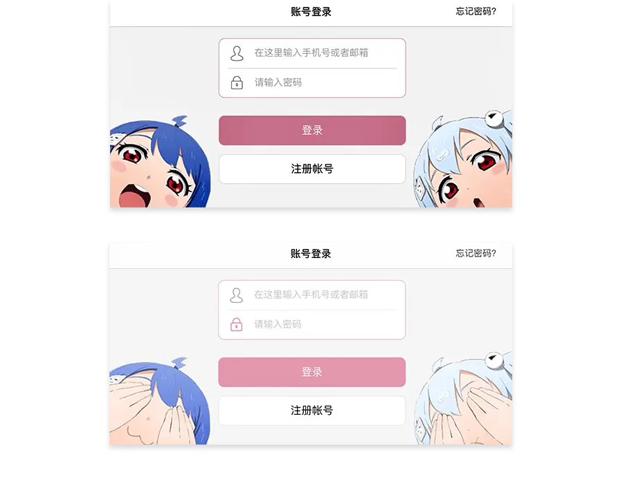 (1)微交互增加乐趣——哔哩哔哩在输密码之前两个小女孩是睁大眼睛的,点到密码输入框,两个女孩立即蒙上眼睛,这与哔哩哔哩这个产品传递的可爱的品牌感十分契合,也为用户枯燥的登录过程增添了几分乐趣。