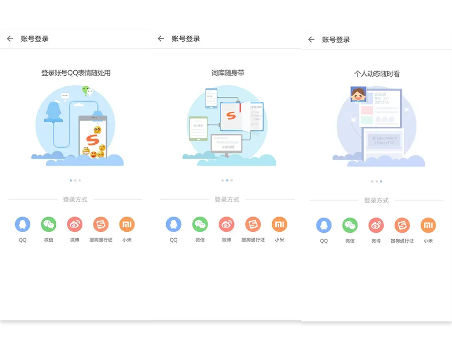 第三种,这种情况注册登录页不需要承担上文第二种情况需要承担的功能,但和第二种情况又有所不同的是用户即使不注册也能够使用几乎所有功能,因此新老用户没有什么区别,那视觉设计的作用在于明确的告诉用户:“你”为什么要注册?,下图是搜狗输入法通过插画的形式告诉用户注册账号之后的“好处”是什么。
