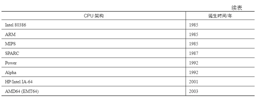 经过几十年的发展,到今天已经相继诞生或消亡过了几十种不同的CPU架构。表1-1为近几十年来知名CPU架构的诞生时间表。什么是CPU架构?下面让我们来探讨区分CPU的主要标准:CPU的灵魂—指令集架构(Instruction Set Architecture,ISA)。