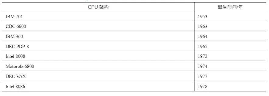 表1-1 知名CPU架构的诞生时间表