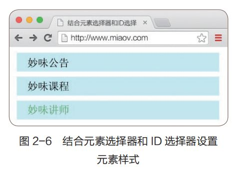 上述代码中有 3 个 div 元素,其中第 3 个 div 设置了 id 属性,值为“teacher”。CSS 代码通过匹配 id 属性值,可知 ID 选择器选中了第 3 个 div 元素,因而其设置的绿色文本颜色以及加粗样式,只对第 3 个 div 元素有效,其他两个 div 元素的样式则保持默认效果。 示例 2-3 的运行结果如图 2-5 所示。
