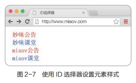 上述代码的运行结果和图 2-7 完全相同。 在 2.3.2 小节中,我们知道,ID 选择器可以在一组同类元素中选取某个元素,其实类选择器同样具有这个能力,但不同的是,类选择器可一次性选取若干个元素。