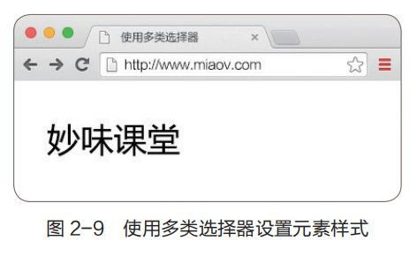 此外,还有一种工作中不常见的选择器——多类选择器,为保证知识点的完整,在本书中对其做简单介绍,它的设置方式依然是 class="miaov green hot",但在定义 CSS 选择器时,需要以 .miaov.green.hot 作为选择器名称,这种选择器称之为多类选择器。