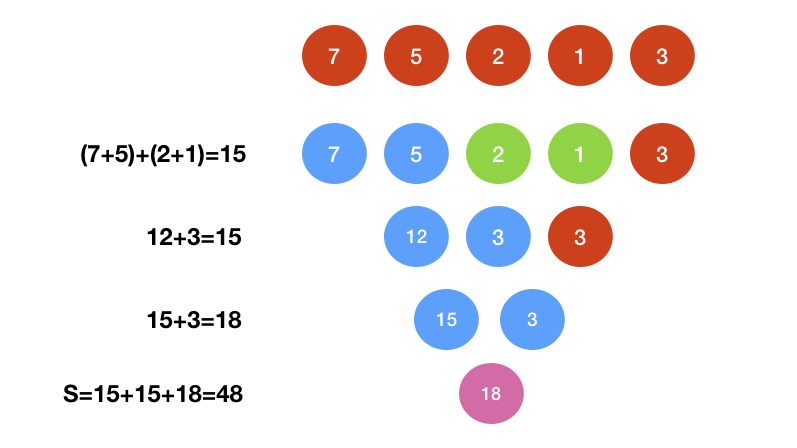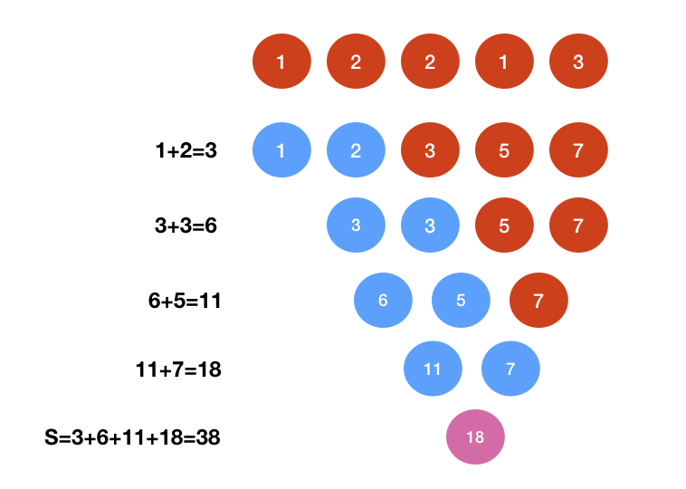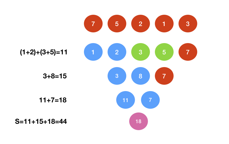 - 有N堆果子,没堆果子的数量为Ai,每次可以将两堆果子合并,每次合并将消耗两堆果子总数的体力。
