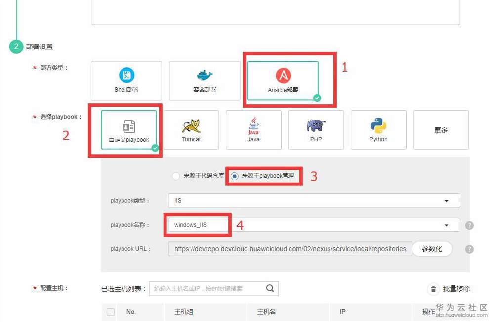 Ø 填写部署任务名称,“部署设置”选择“Ansible部署”,模板选择“自定义playbook”并选择自己上传的playbook脚本。