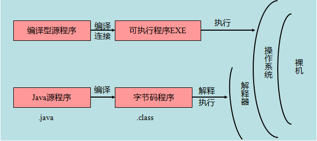 - Java首先利用文本编辑器编写Java源程序,源文件的后缀为.java;再利用编译器(javac)将源程序编译成字节码文件,字节码文件的后缀名为.class;最后利用虚拟机(解释器.java)解释执行.
