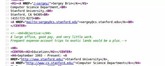 谢尔盖.布林(Google 的联合创始人之一)在斯坦福大学念计算机科学博士学位的时候,他的简历里并不含任何”待遇要求“(Objective)的字眼。但当你去查看他的简历的 HTML 源代码的时候,你会看到(他在简历 HTML 源文件里明确写了“待遇要求”,只是用注释注掉了,在浏览器页面上不显示。):