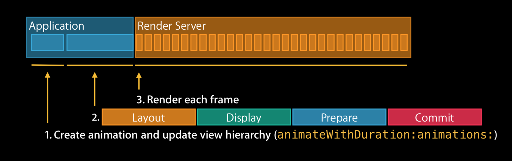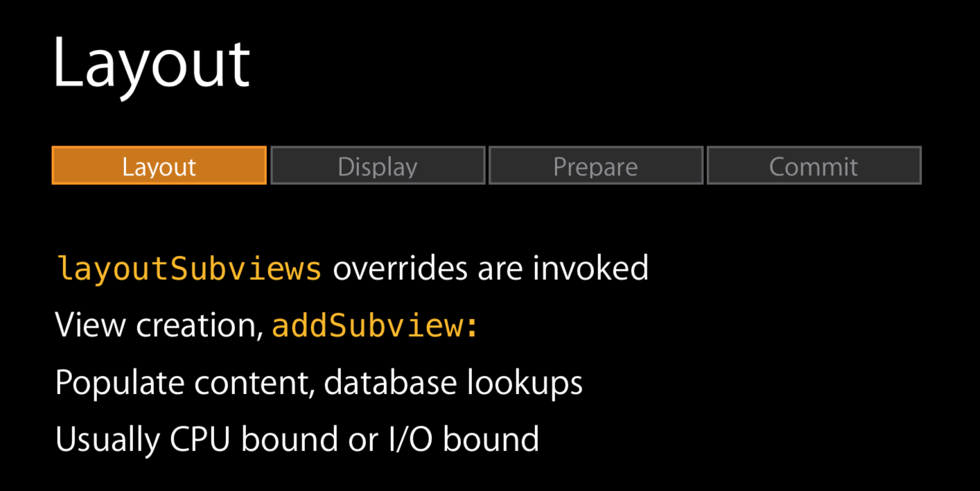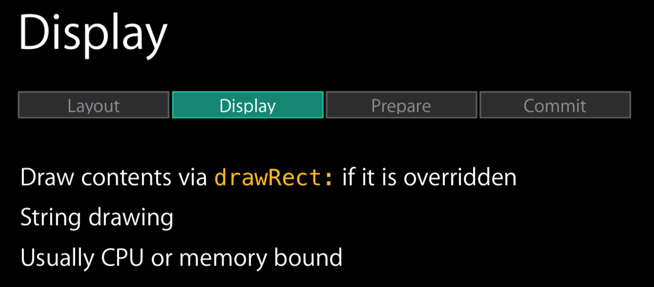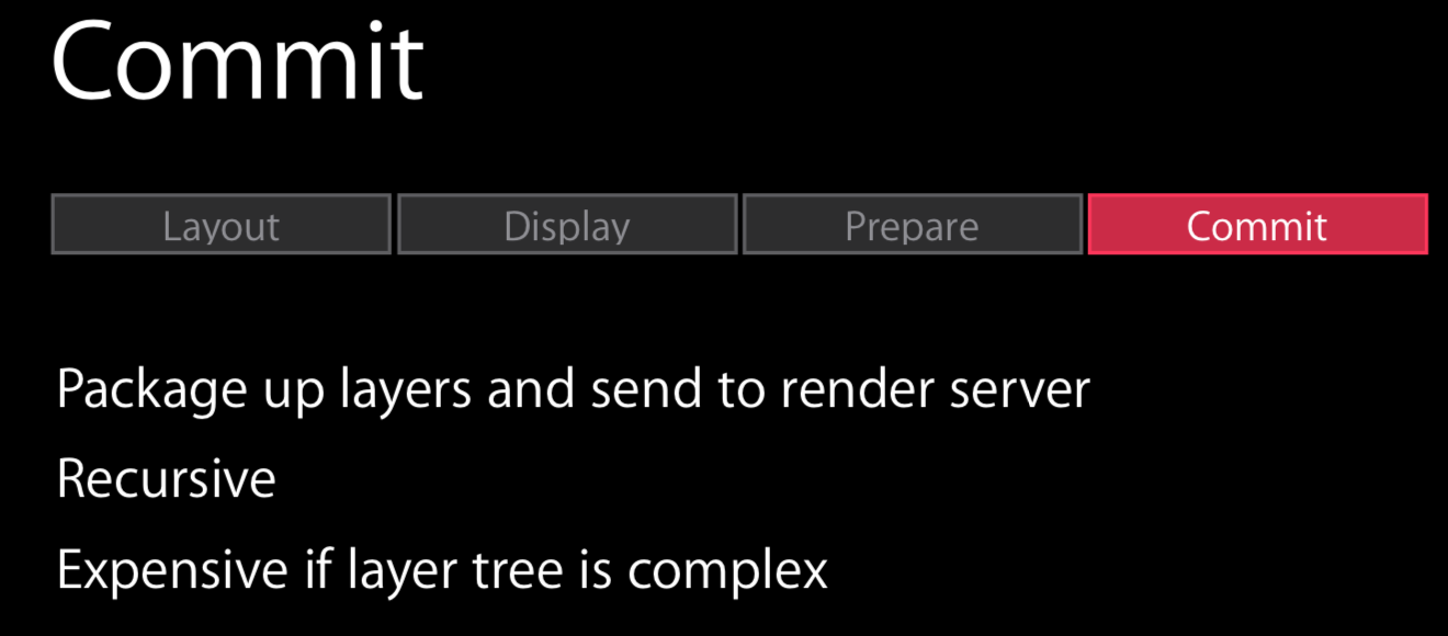 - 其次,app 通过 CPU 完成对显示内容的计算,如:视图的创建、布局计算、图片解码、文本绘制等。在完成对显示内容的计算之后,app 对图层进行打包,并在下一次 RunLoop 时将其发送至 Render Server,即完成了一次 Commit Transaction 操作。