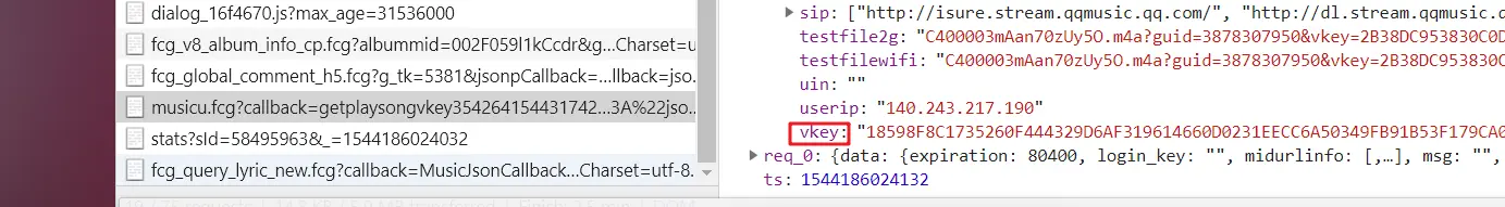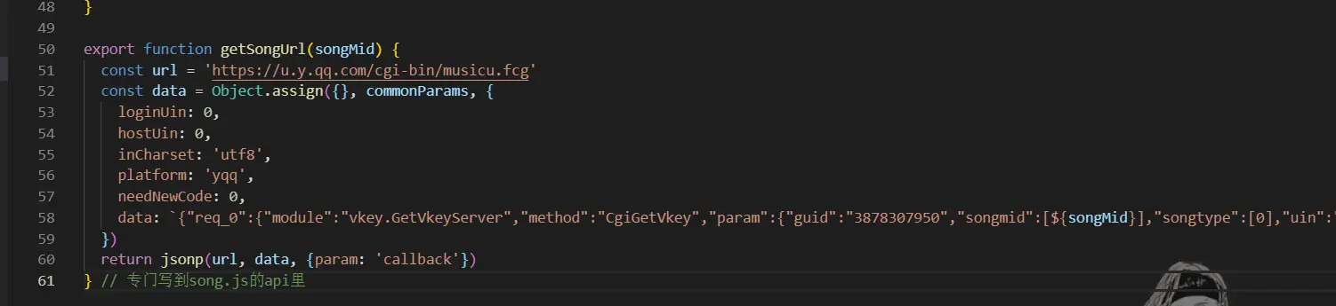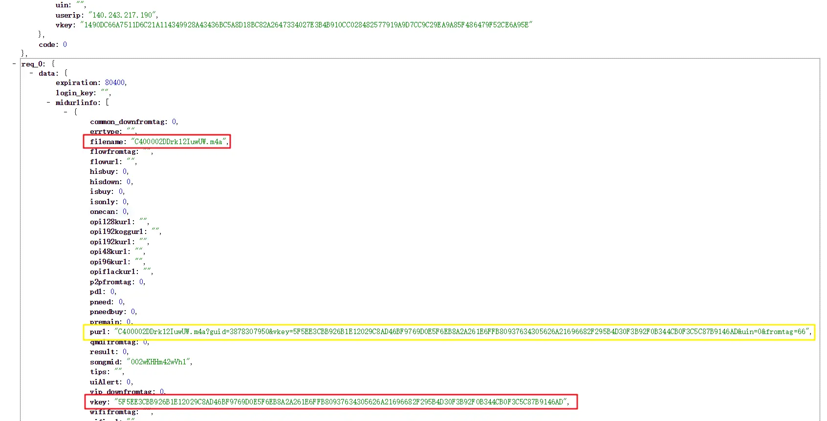 用了模板字符串的语法,可见songmid、vkey是可变参数,guid、uin、fromtag是固定参数。