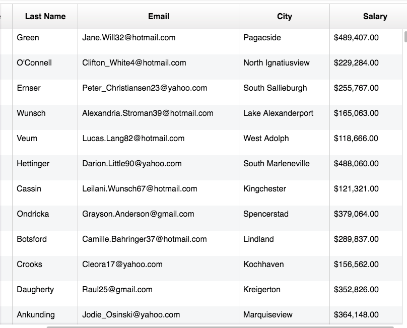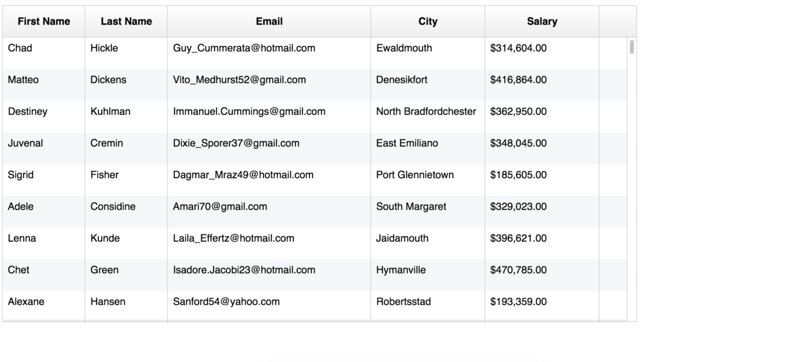 function App() { const data = getData(); return ( <div className="App"> <Table rowHeight={50} rowsCount={data.length} headerHeight={50} width={1000} height={500} > <Column columnKey="firstName" header={<Cell>First Name</Cell>} width={130} cell={({ rowIndex, columnKey }) => { return <Cell>{data[rowIndex][columnKey]}</Cell>; }} /> <Column columnKey="lastName" header={<Cell>Last Name</Cell>} width={130} cell={({ rowIndex, columnKey }) => { return <Cell>{data[rowIndex][columnKey]}</Cell>; }} /> <Column columnKey="email" header={<Cell>Email</Cell>} width={320} cell={({ rowIndex, columnKey }) => { return <Cell>{data[rowIndex][columnKey]}</Cell>; }} /> <Column columnKey="city" header={<Cell>City</Cell>} width={180} cell={({ rowIndex, columnKey }) => { return <Cell>{data[rowIndex][columnKey]}</Cell>; }} /> <Column columnKey="salary" header={<Cell>Salary</Cell>} width={180} cell={({ rowIndex, columnKey }) => { return <Cell>{data[rowIndex][columnKey]}</Cell>; }} /> </Table> </div> );}We configure the table with our data and create a Column for each field we want displayed.