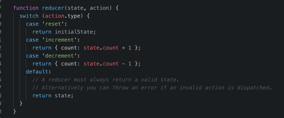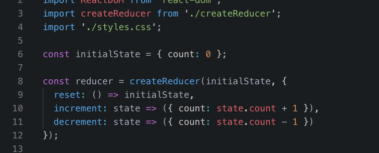 function createReducer(initialState, handlers) { return function reducer(state = initialState, action) { if (handlers.hasOwnProperty(action.type)) { return handlers[action.type](state, action) } else { return state } }}It’s a helper function from the Redux docs that lets you describe reducers as mappings from action types to handlers.