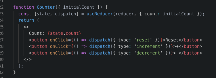 The Counter component calls useReducer with a reducer and initial state, which gives back an array with the current state and a dispatch function.